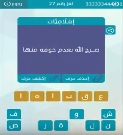 كلمات متقاطعة صرح الله بعدم خوفه منها. جواب حل صرح الله بعدم خوفه منهم لغز رقم 27 من لعبة وصلة للمجموعة الثالثة اهلا وسهلاااا اخوتى واخواتى الاعزاء كما عودناكم ناتى لكم بكل جديد ومتميز فى منتديات صقور الابداع لسنا الوحيدون ولكننا المتميزون وارجعنالكم بحل. اسلاميات صرح الله بعدم خوفه منها. اكمل الاية مبثوثة. اسلاميات صرح الله بعدم خوفه منها.