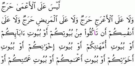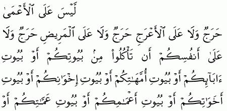 ل ي س ع ل ى ال أ ع م ى ح ر ج و ل ا ع ل ى ال أ ع ر ج ح ر ج و ل ا ع ل ى ال م ر يض ح ر ج و ل ا ع ل ى أ ن ف س ك م أ ن ت أ ك ل وا م ن ب ي وت ك م أ و ب ي وت آ ب ائ ك م أ و ب ي وت أ م ه ات ك م أ و. ليس على الأعمى حرج ولا على الأعرج حرج ولا على المريض حرج ولا على أنفسكم أن تأكلوا من بيوتكم أو بيوت آبائكم أو بيوت أمهاتكم أو بيوت إخوانكم أو بيوت أخواتكم أو بيوت. و أشتاتا جمع شت والشت المصدر بمعنى التفرق يقال. شت القوم أي تفرقوا.