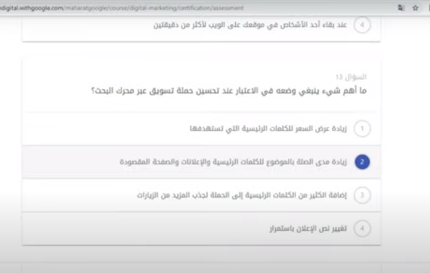ما أهم شيء ينبغي وضعه في الاعتبار عند تحسين حملة تسويق عبر محرك البحث. ما أهم شيء ينبغي وضعه في الاعتبار عند تحسين حملة تسويق عبر محرك البحث الاجابة الصحيحة هي. الاختيار رقم 2 زيادة مدى الصلة بالموضوع للكلمات الرئيسية والإعلانات والصفحة المقصودة. ما أهم شيء ينبغي وضعه في الاعتبار عند تحسين حملة تسويق عبر محرك البحث 1 زيادة عرض السعر للكلمات الرئيسية التي تستهدفها. اجابة أختبار الشهادة لمهارات جوجل فى التسويق الرقمى نموذج 2 مهارات جوجل إجابة مهارات جوجل إجابة أختبارات جوجل نماذج مهارات جوجل مجابة محلولة مصر المغرب العراق الولايات المتحدة لبنان تونس ليبيا.