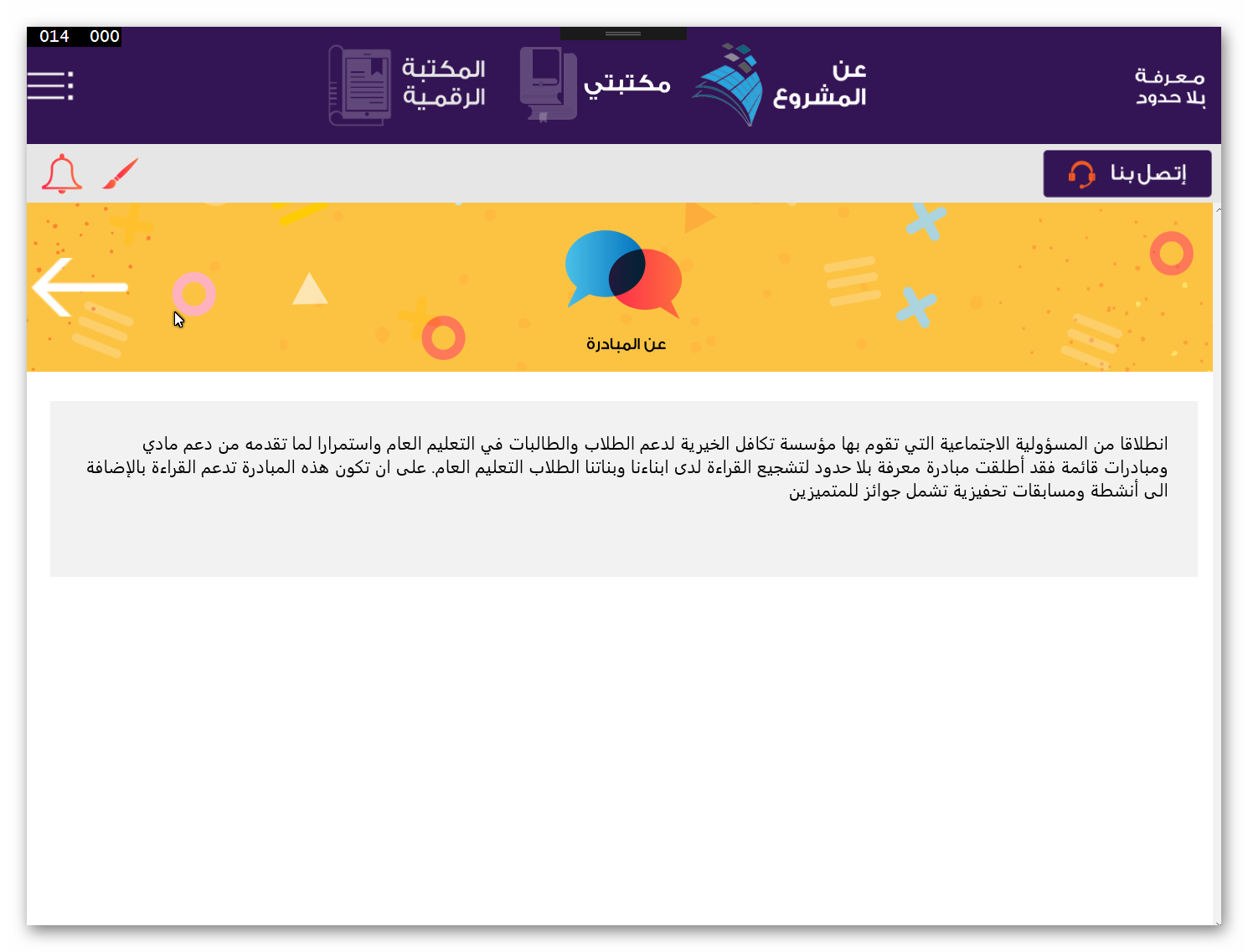 برنامج تكافل مبادرة معرفة بلا حدود. تم إطلاق مبادرة معرفة بلا حدود. حسب المرحلة التعليمية بهدف غرس حب القراءة والمعرفة. معرفة بلا حدود هو مساق مجاني مقد م من إدراك يتناول مفهوم المعرفة المفتوحة ودور التعليم المفتوح في تقد م وتطور مجتمعاتنا والمصادر التعليمية المفتوحة مع المصادر التربوية المفتوحة على حد سواء.